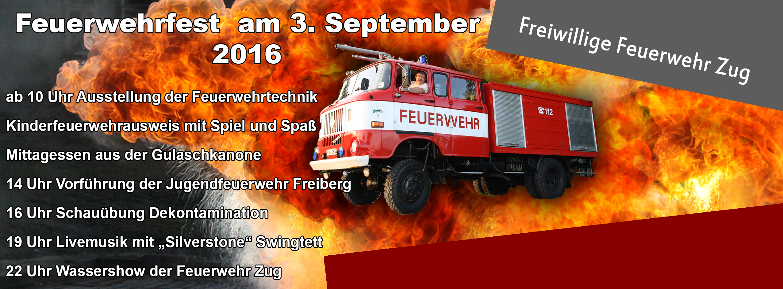 Feuerwehrfest am 3. September 2016 FFwZug 31. August 2016 Aktuelles Am 3. September wird im Gelände es Haldenparks der Tag der offenen Tür unserer Feuerwehr stattfinden. https://www.facebook.com/events/1707219196232656/ ← Vorheriger Beitrag Nächster Beitrag →